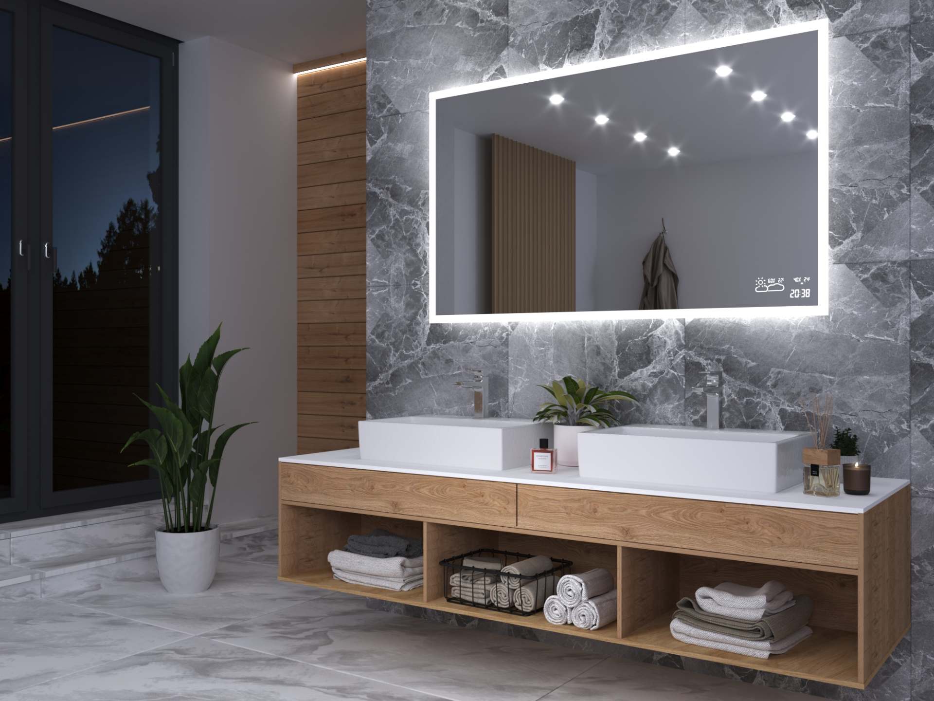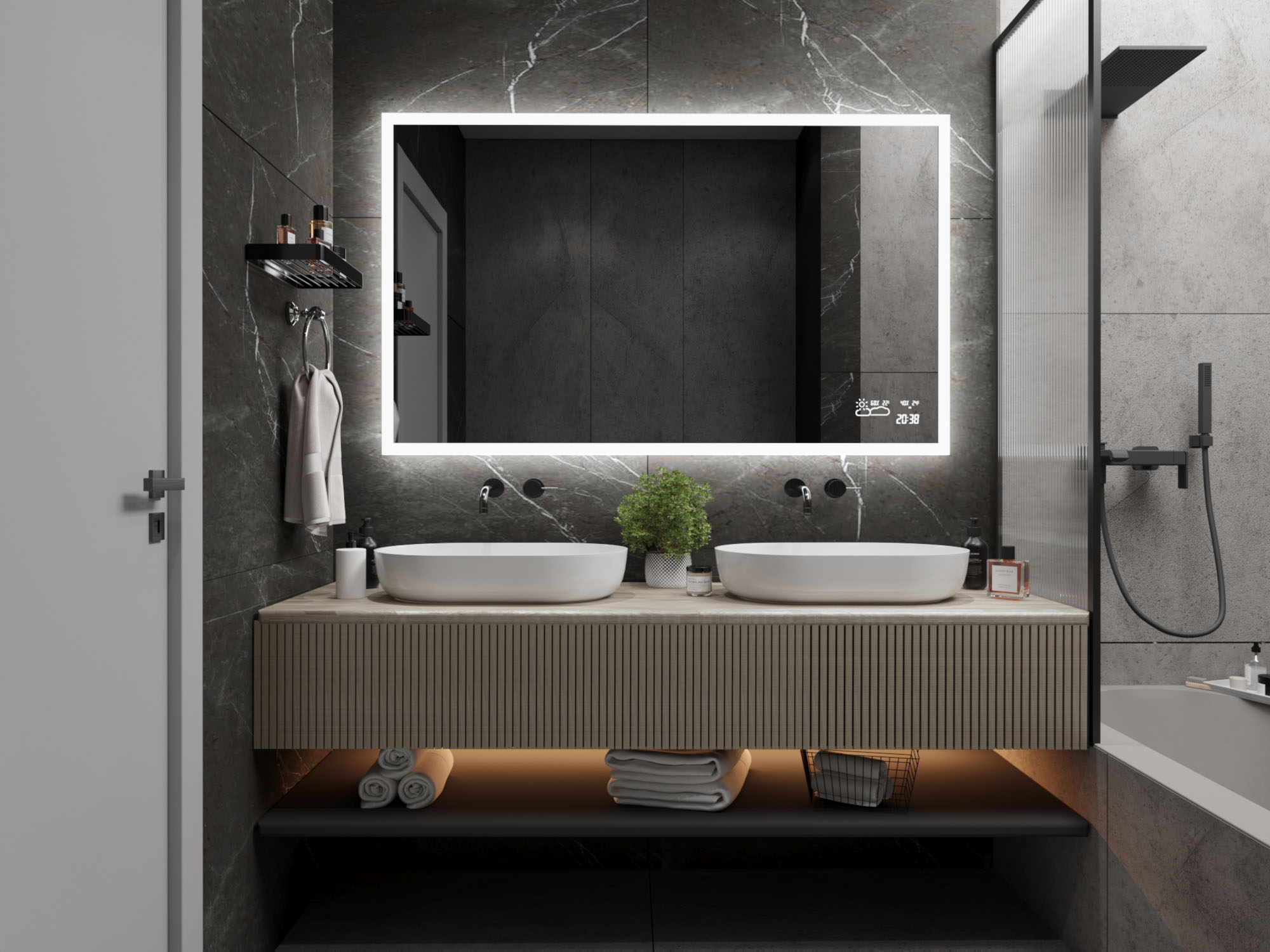 Razkošno dizajnersko LED ogledalo bo iz vaše kopalnice naredilo nov prostor, ne le zaradi svoje lepote in uporabnosti, ampak predvsem zaradi več kot 7 mogočih dodatkov, med katerimi lahko navedemo npr. bluetooth zvočnik, uro, grelno preprogo, vgrajeno kozmetično ogledalo ali dodatno polico.
